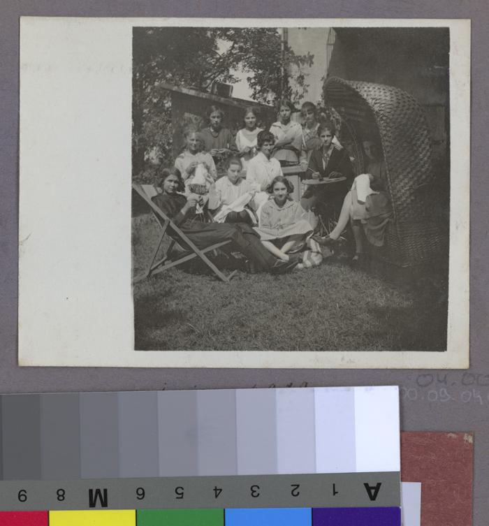 La Clairière, préventorium pour jeunes filles: le jardin avec les pensionnaires et des membres du personnel (?) autour d'une table.