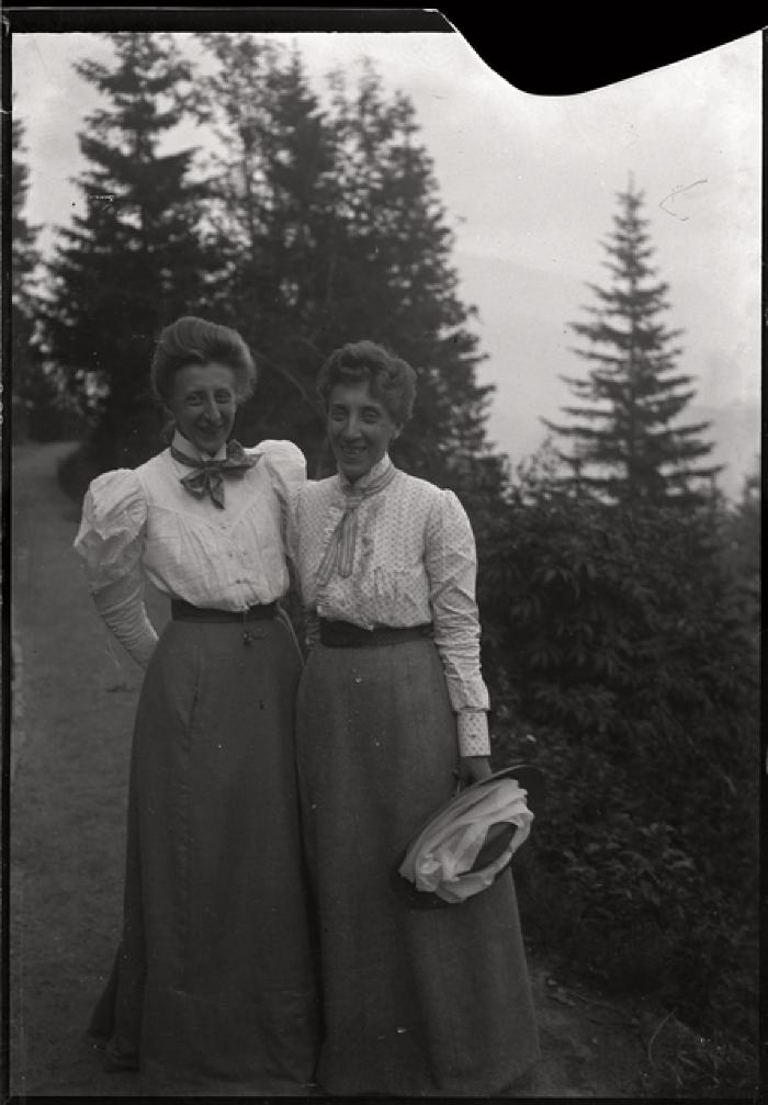 Collection photographique IHM-MHL ➔ La doctoresse Charlotte Olivier accompagnée d'une dame en promenade sur un chemin de montagne.