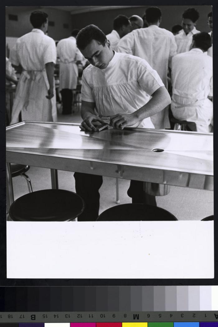 Préparation du matériel lors d'un cours non identifié (anatomie ?).