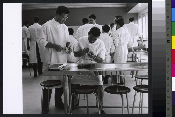 Préparation du matériel lors d'un cours non identifié (anatomie ? d'après les deux pied de ce qui semble être un cadavre allongé sur une table au second plan).