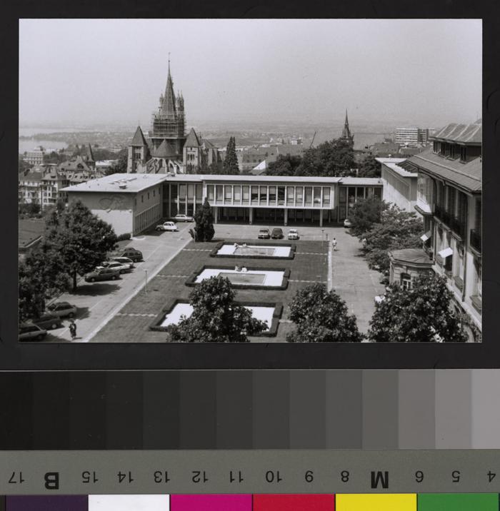 Collection photographique IHM-MHL ➔ Ecole de médecine de la rue du Bugnon: jardins, parking et préau.