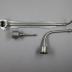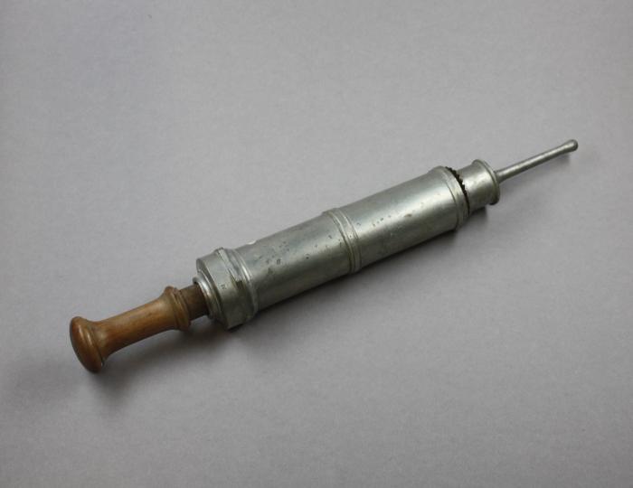 Dans une boîte en bois, clystère en étain avec plusieurs embouts (vaginal, anal, et embout pour auto-lavement.