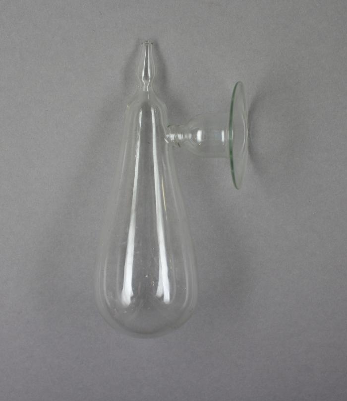 Tire-lait en verre en forme de poire. Une ouverture évasée permet l'application sur le sein, alors qu'un petit goulot permet la fixation d'un tube en caoutchouc pour l'auto-aspiration.