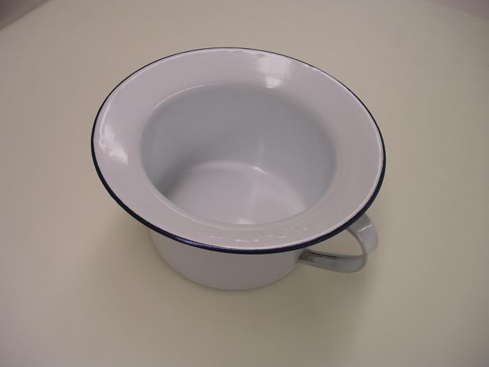 Pot de chambre cylindrique pour enfant, avec un anse, en émail blanc au bord bleu.