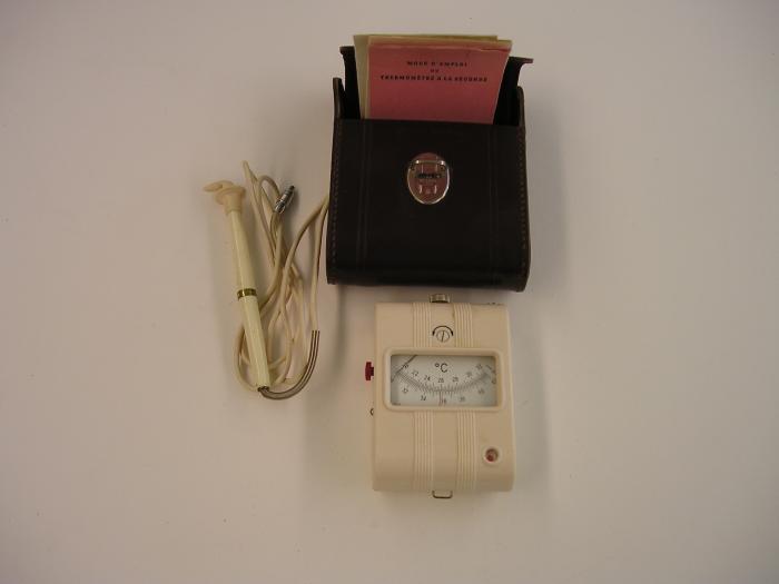Thermomètre “à la seconde” gradué de 30 à 42° Celsius, cordon et raccord + batteries dans boîtier en bakélite ivoire, dans étui de cuir brun. Ainsi qu'un mode d'emploi et un explicatif de la technique de la mesure à l'aide du thermomètre à la seconde.