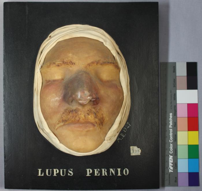 Cire dermatologique (moulage) sur planche de bois peinte en noir, entourée d’un tissu. Signé MD et daté de 1927. Petite étiquette de papier “192”, inscription 64 au verso.