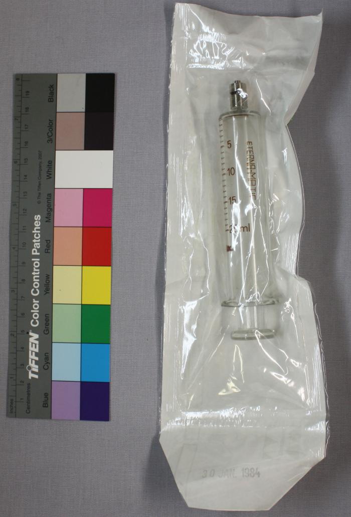 Seringue 20 ml en verre, marque sanitex, dans son emballage stérile daté du 30 janvier 1984