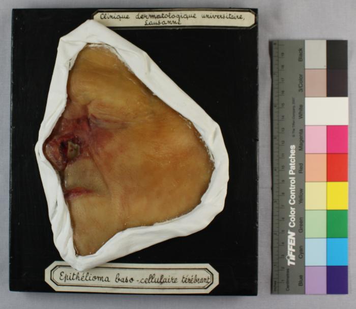 Cire dermatologique (moulage) sur bois peint en noir. 2 étiquettes (CDUL et titre) Verso: Epithélioma baso-cell. térébrant Mr Périer 1934 N°26 A 31
