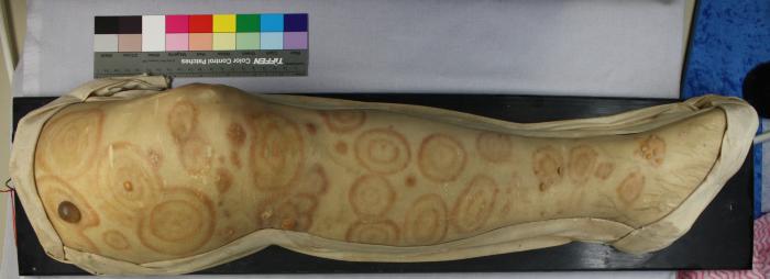 Cire dermatologique (moulage) sur bois peint en noir, sans mention de la maladie représentée. Verso: 57