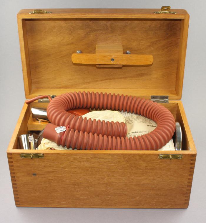 Appareil d'anesthésie mis au point par Louis Ombrédanne (1871-1956) en 1907 et utilisé jusque dans les années 1930. Il permet de contrôler la quantité d'anesthésiant dans l'air que respire le patient grâce à la mollette graduée de 0 à 8. Ce système a été conçu afin d'éviter les surdosages parfois mortels.