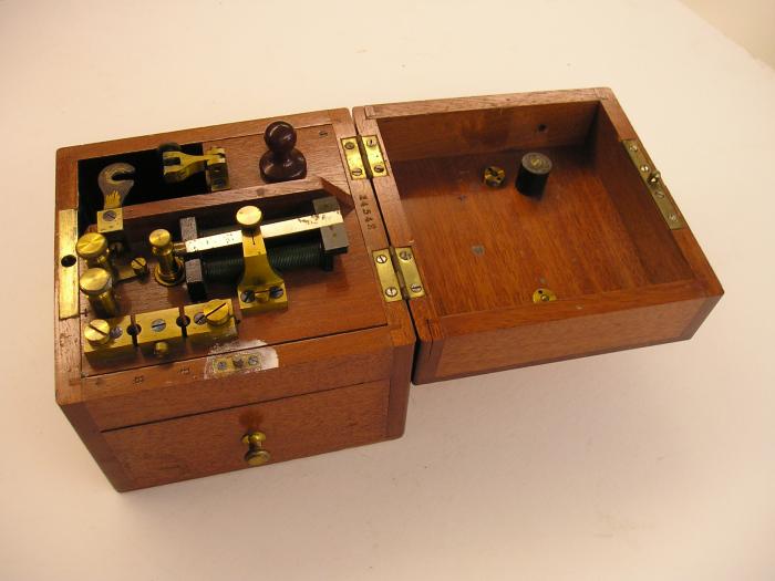 Appareil d’électrothérapie s'apparentant à l'appareil portatif d'induction d'après le Dr. Spamer dans petite boîte en acajou poli. Choix d’ électrodes dans tiroir latéral: - un fil électrique gainé de tissu vert à deux embouts en forme d’aiguille - un fil électrique gainé de tissu rouge à deux embouts en forme d’aiguille - 2 poignées en bois - 5 électrodes différentes - 1 cylindre métallique - petite pièce tres oxydée (?) - 3 bâtonnets de metal très oxydés - s’effritent!!!