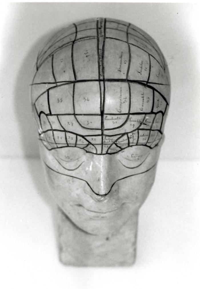 Tête phrénologique en plâtre blanc devenu gris avec le temps, nécessite une restauration.