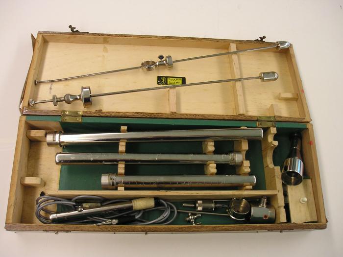 Matériel de recto-sigmoïdoscopie comprenant: 4 tubes de 38 - 33 cm - 28 cm - 23 cm avec mandrins, 2 oculaire, cordon électrique et lampes pour éclairage interne dans caissette de bois recouverte de papier auto-collant brun.