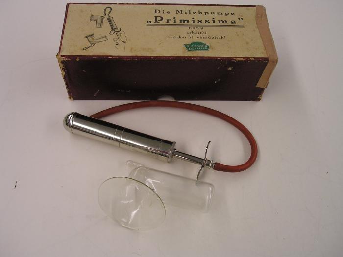Récipient de verre s’ouvrant sur un pavillon avec embout pour raccorder le tuyau de caoutchouc rouge et la pompe en métal de Dans carton d’origine rouge Longueur 24cm - Profondeur 9cm - Hauteur 8cm