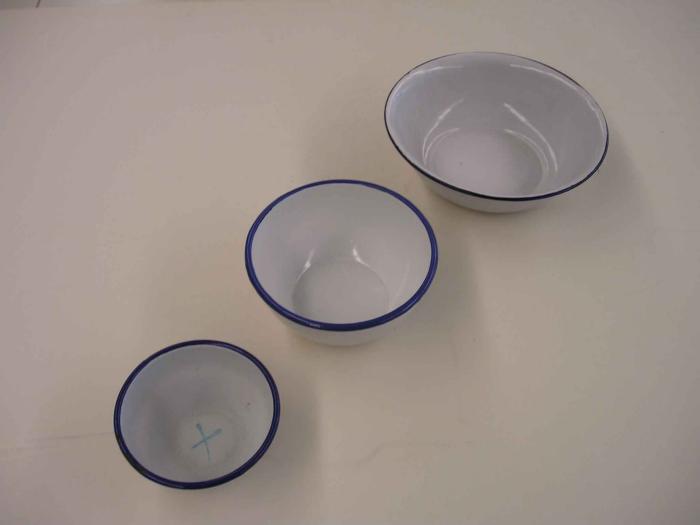 Cuvette en émail blanc avec bords bleus.