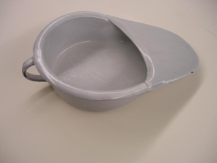 Bassin de lit allongé pour être glissé sous le dos du patient. En dessous de l’objet on distingue l’écusson d’une marque: il s’agit d’un Z inscrit dans un pichet. Cette marque reste non-identifiée.