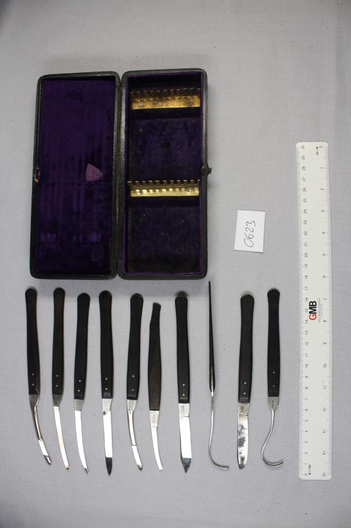 boîte noire en cuir ou simili. ornement poinçonné sur le couvercle. Mandorle métallique au centre, sans inscription. Boîte endommagée au niveau de la charnière, rafistolée avec scotch noir (d’électricien?) intérieur velours violet, un peu marqué. contient 10 instruments (scalpels, passe-fils).