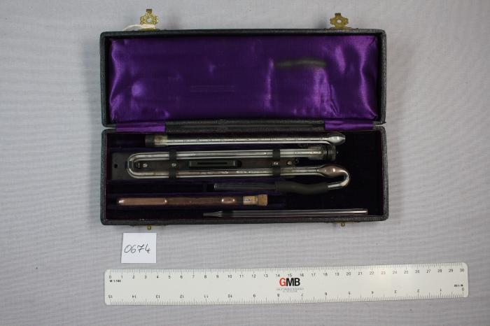 Etui noir à deux fermoirs dorés, intérieur de satin et velours violet. Contient: - un tube gradué - un petit tube en verre contenant du mercure et poudre rouille - pièce centrale à deux coudes - autre tube
