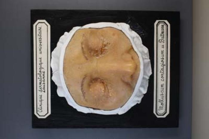 Cire dermatologique (moulage). deux étiquettes (titre et “clinique dermatologique universitaire, lausanne). Verso: 2 listes de bois et crochet en métal. Inscriptions:Molluscum contagiosum de battmann. 1672. 14. 7. et autre inscription indéchiffrable: acne va?