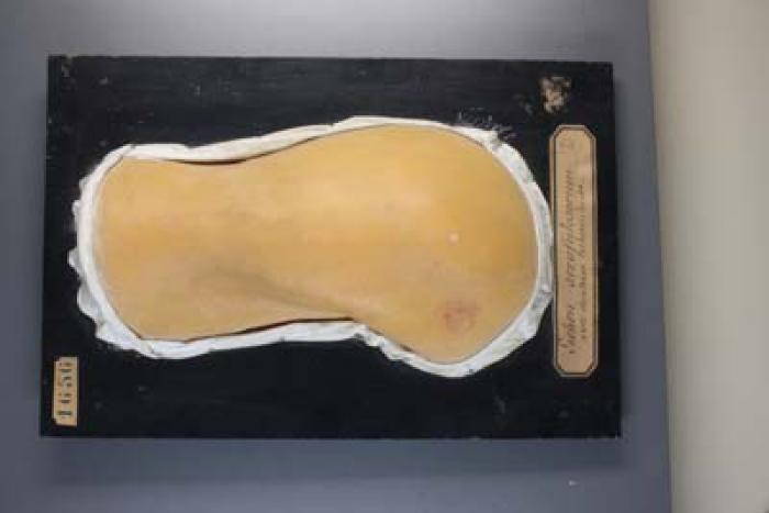 Cire dermatologique (moulage) sur planche en bois peint en noir. 2 étiquettes (titre et 1656). Signature de J Baretta. Verso: 1696. 46 2 listes en bois et un crochet en métal. décoloration autour des clous.