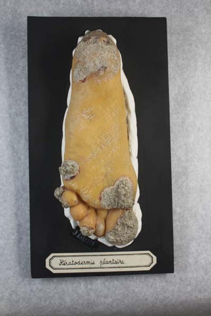 cire dermatologique (moulage) sur planche en bois peint noir. signature j baretta. 1 étiquette (titre) verso: 313/183 ; 3 ; 59 ; kératodermie plantaire. listes et metal.