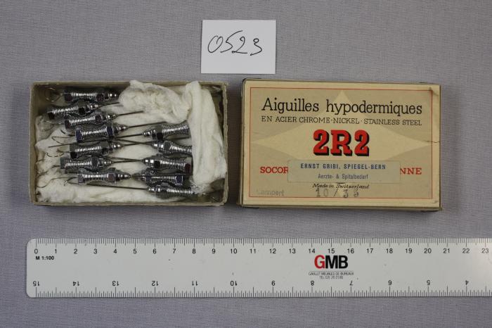 Boîte en carton avec diverses aiguilles. Sur la boîte: “Aiguilles hypodermiques. En acier chrome-nickel. Stainless steel. Made in Switzerland.” Etiquette “Ernst Gribi, Spiegel-Bern. Aerzte- & Spitalbdarf”