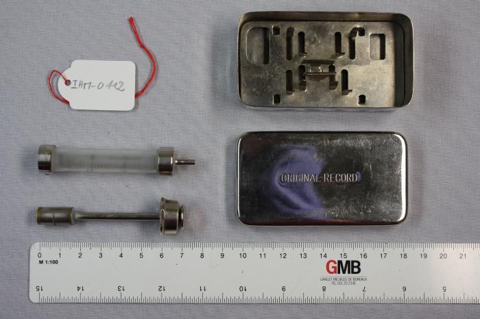 Seringue en métal avec réservoir en verre “Socorex. Swiss made”. Pompe en métal. Boîte en métal. Inscription sur le couvercle “Original-Record”