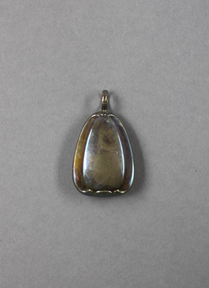 Grelot en métal, plat, avec ornement. Lié à la collection de hochets.