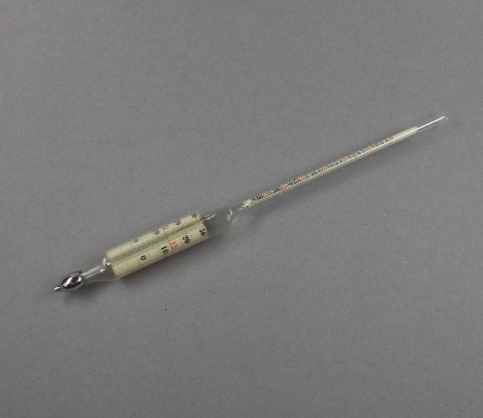 Alcoomètre en verre, calibré par la Régie fédérale des alcools (Eidgenössische Alkoholverwaltung), pour définir le volume d'alcool dans un liquide, en pourcents du poids, temp. 15 °C