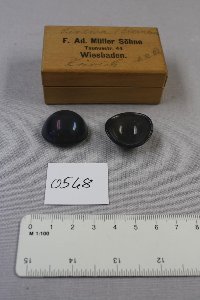 Lentilles protectrices pour les yeux lors des radios. Dans boîte en bois.